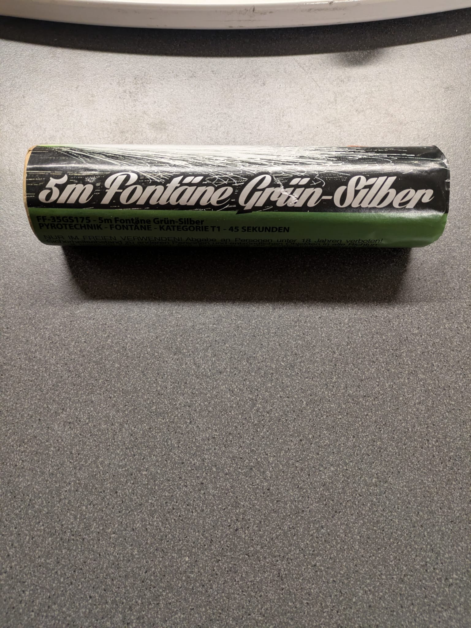 Große, raucharme Fontäne mit 45 Sekunden Brenndauer und bis zu ca. 5m Effekthöhe. Effekt: Grüne Leuchtbasis mit Silberfunken-Fontäne